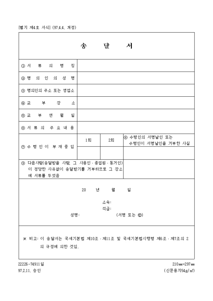 이 송달서는 국세기본법 제10조․제11조 및 국세기본법시행령 제6조․제7조의 2의 규정에 의한 것임.