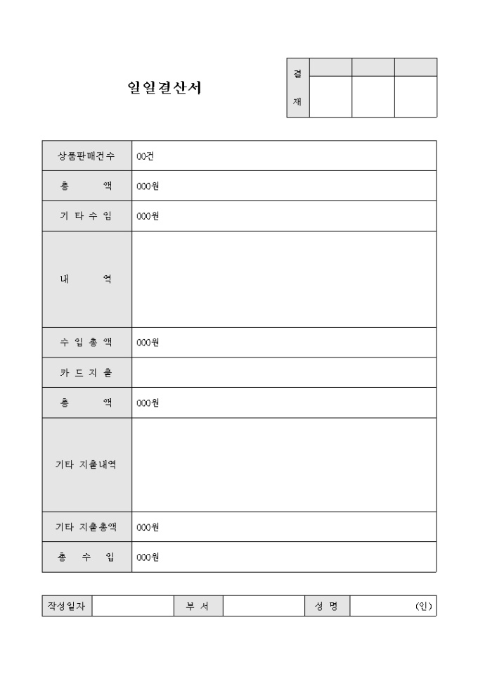 9,000원/월상품판매건수와 내역, 기타 지출내역의 항목을 포함한 다수의 항목으로 구성된 일일 결산서입니다.