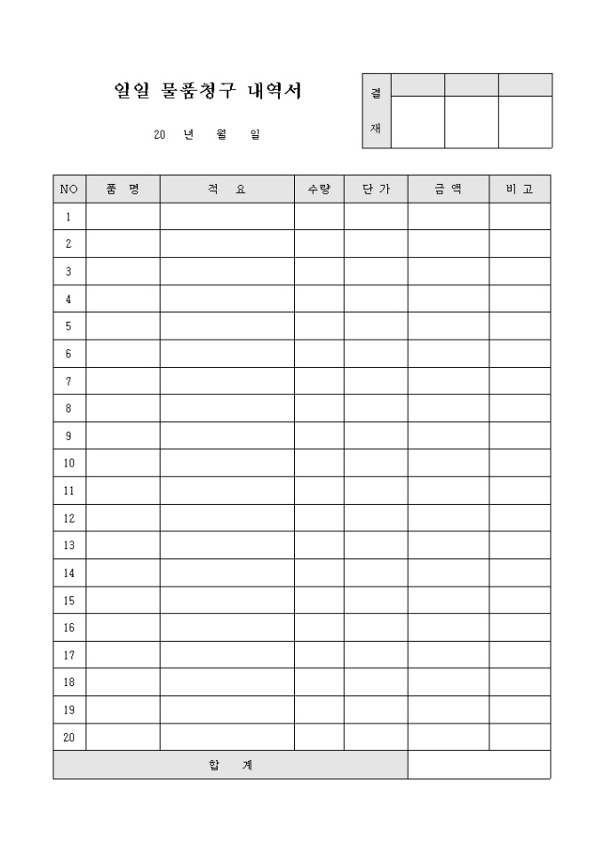 물품 청구시 사용되는 일일 물품청구 내역서 입니다. 물품의 수량과 단가 및 금액을 기록할 수 있도록 구성되어 있습니다.