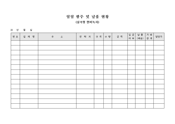 9,000원/월제품의 일일 발주 및 납품 현황을 파악하기 위하여 작성하는 일일 발주 및 납품 현황 서식입니다. 거래 업체의 업체명, 주소, 연락처와 제품의 규격, 수량, 금액, 입금여부, 납품 등의 항목을 기재할 수 있습니다.