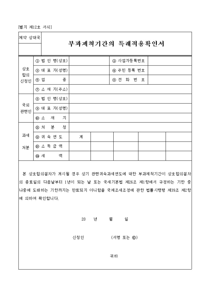 9,000원/월[별지 제12호 서식] 부과제척기간의특례적용확인서 양식입니다. 본 상호합의절차가 개시될 경우 상기 관련귀속과세연도에 대한 부과제척기간이 상호합의절차의 종료일의 다음날부터 1년이 되는 날 또는 국세기본법 제26조 제1항에서 규정하는 기한 중 나중에 도래하는 기한까지는 만료되지 아니함을 국제조세조정에 관한 법률시행령 제39조 제2항에 의하여 확인합니다. ...