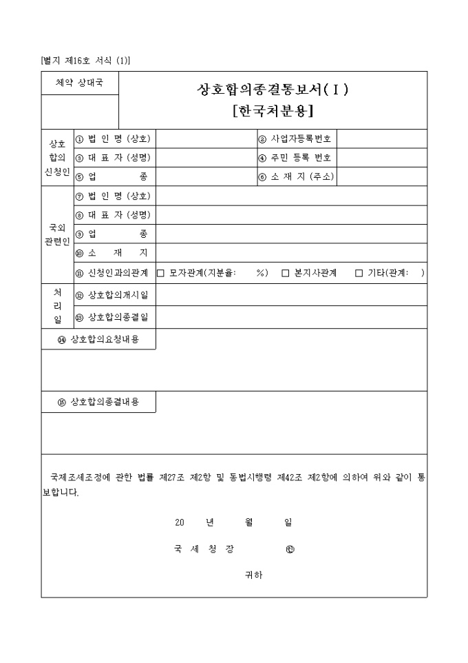 상호합의종결통보서, 한국처분용(국제조세조정에 관한법률 제16호(1))