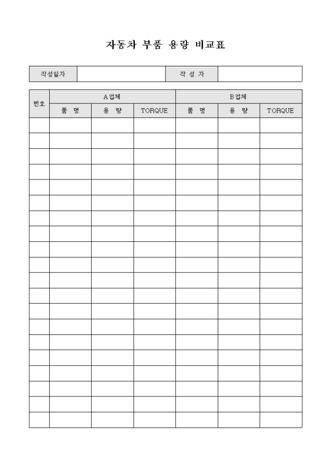 자동차 부품에 대하여 업체별로 용량을 비교하기 위한 자동차 부품 용량 비교표 양식으로 품목별로 업체간의 용량, TORQUE 등을 기재하여 비교할 수 있습니다.