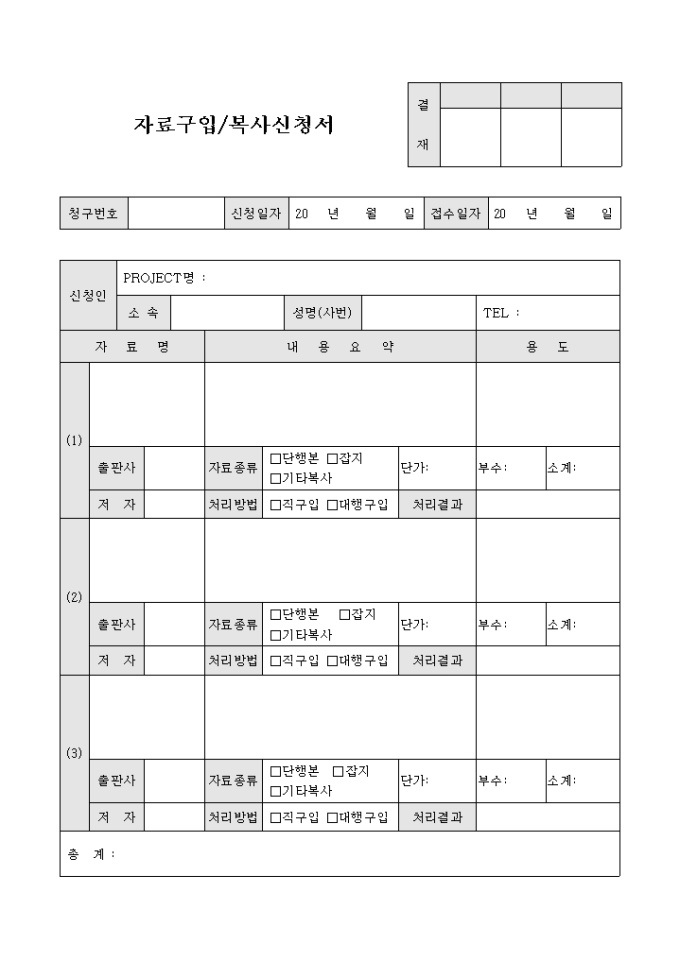 필요한 자료 별로 구입 또는 복사를 신청하기 위한 신청서 서식입니다. 신청인의 간략한 인적사항과 필요자료에 대한 자료명이나 내용 등의 항목에 대하여 작성하여 신청할 수 있습니다.