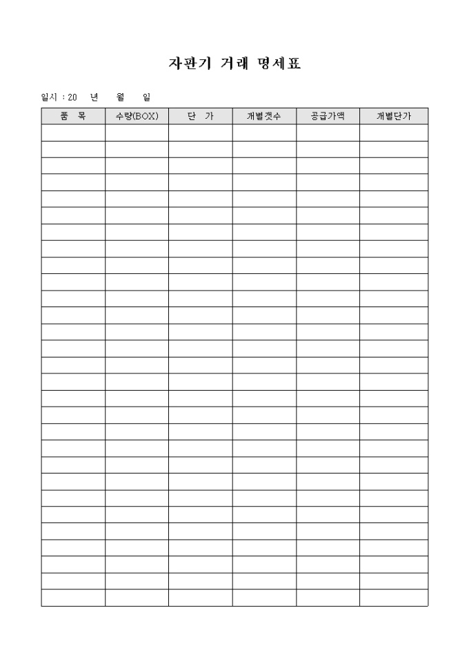 자판기의 내용품에 대한 거래 내역을 기록하는 자판기 거래 명세표 양식으로 품목과 수량, 단가, 개별갯수, 공급가액, 개별단가 등의 항목을 기재할 수 있습니다.
