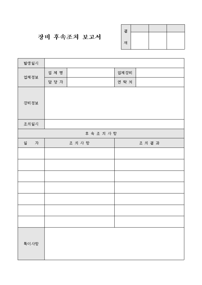 장비의 일자별 조치사항과 조치 결과를 기록 보고시 사용하는 장비 후속조치 보고서입니다.