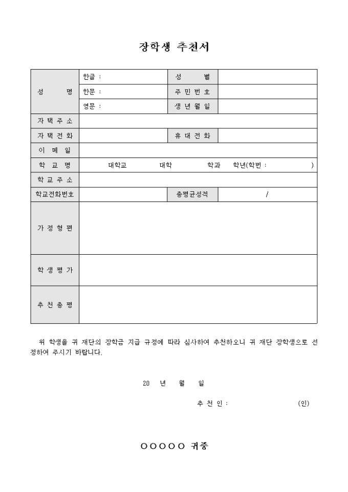9,000원/월재단의 장학금 지급 규정에 따라 심사하여 장학생으로 선발 돼 추천을 할 때 사용할 수 있는 서식으로 학생의 인적사항과 총평균성적 및 가정형편과 학생평가 내용을 기록합니다.