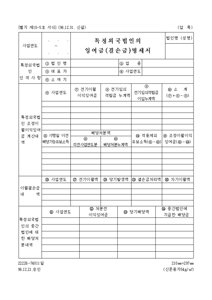 특정외국법인의잉여금,결손금명세서 양식입니다.