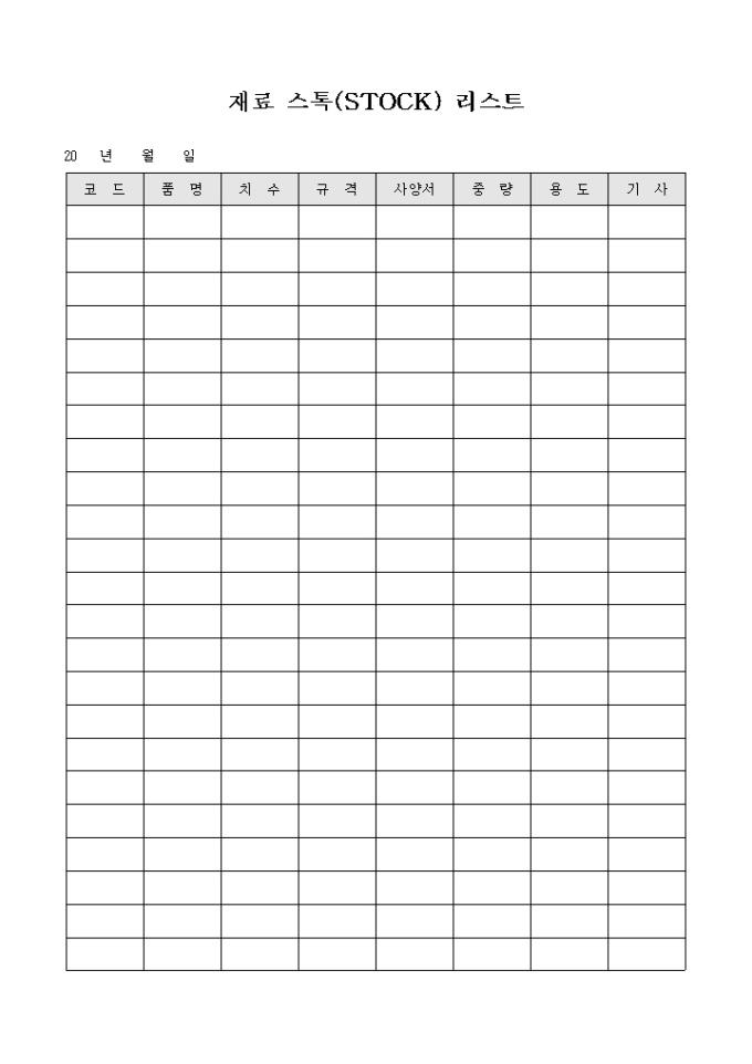 9,000원/월재료의 전체 사항을 기록하는 리스트 양식으로 재료의 품명, 치수, 규격, 사양서, 중량, 용도 등의 항목으로 구성되어 있습니다.