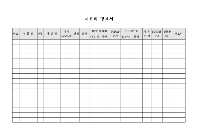 9,000원/월재료비의 명세 내용을 기록 할 때 사용하는 재료비 명세서입니다.