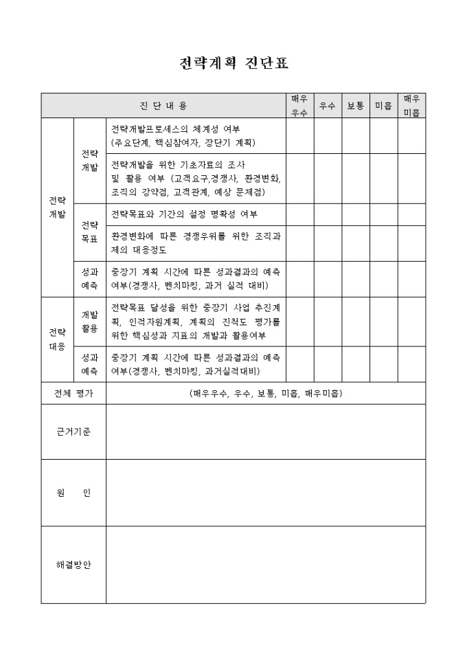 전략개발과 전략대응에 대한 진단내용 등을 기록하고 진단할 수 있도록 구성된 진단표 입니다.