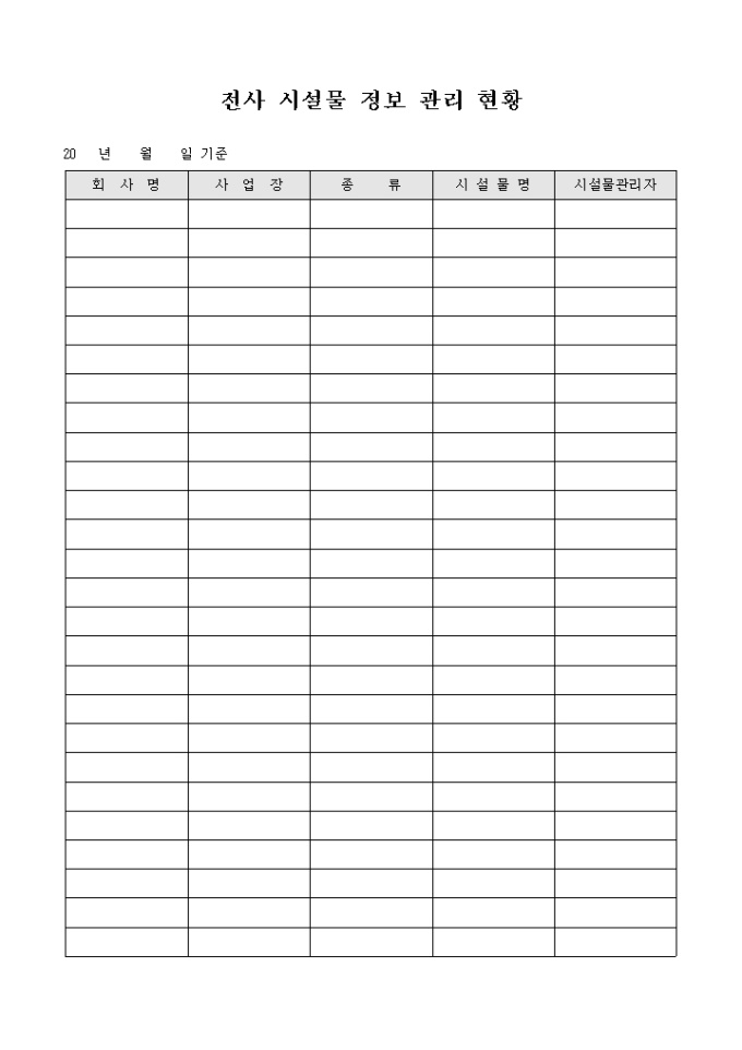 회사명과 사업장의 시설물과 관리자 등을 기록할 수 있는 전사 시설물 관리 현황입니다.
