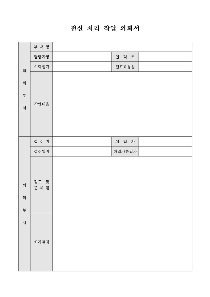 의뢰 부서와 처리부서로 나누어 작업내용별 처리결과등을 기록할 수 있는 전산처리 작업 의뢰서 입니다.