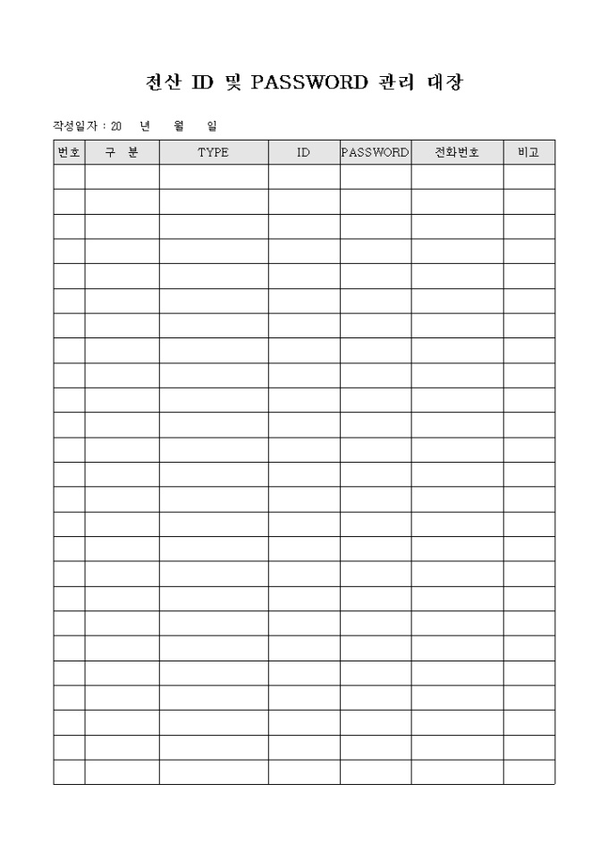 전산 ID 및 PASSWORD를 손쉽게 관리할 수 있도록 구성된 관리대장 입니다. 전산 관리자가 사용하는 관리대장 입니다.