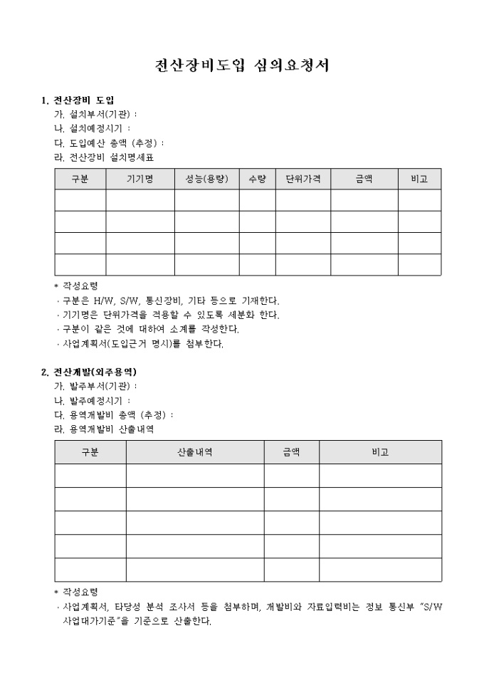 9,000원/월전산 장비의 도입을 요청 할 때 사용하는 심의 요청서입니다. 전산 장비의 설치 기관의 설치 예정 시기와 외주 용역개발비의 산출을 통해 금액을 비교 할 수 있도록 구성되어 있습니다.