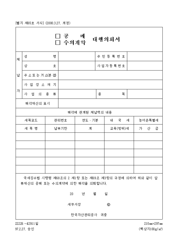 국세징수법 시행령 제68조의 2 제1항 또는 제69조 제3항의 규정에 의하여 위와 같이 압류재산의 공매 또는 수의계약에 의한 매각을 의뢰하실때 사용하는 양식입니다.