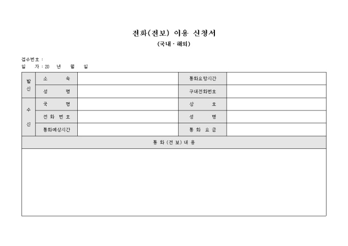 9,000원/월국내와 해외에서 사용이 가능한 전화(전보) 이용 신청서입니다. 통화(전보)의 내용과 발신자와 수신자를 기록 가능합니다.