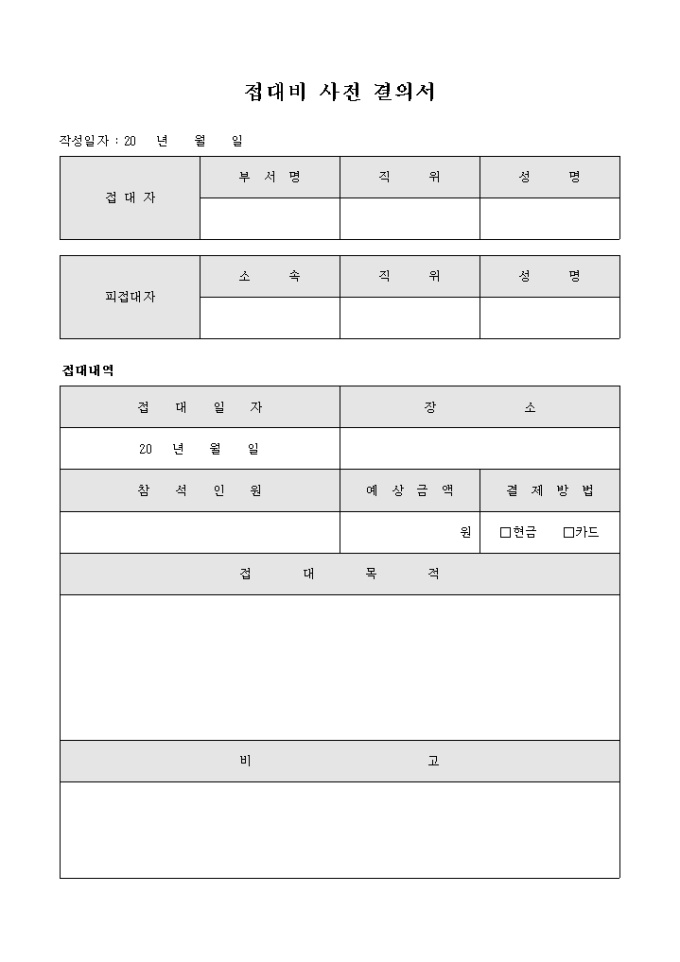 접대내역과 접대 일자 등을 기록할 수 있는 접대비 사전결의서 입니다. 접대목적에 따른 접대 자와 피접대자로 구성됩니다.