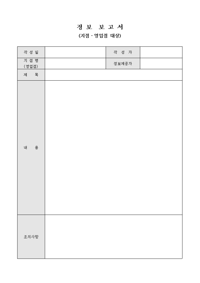 9,000원/월지점, 영업점을 대상으로 한 정보 보고서입니다. 지점별 정보와 내용에 따른 조치사항 등을 기록할 때 사용합니다.