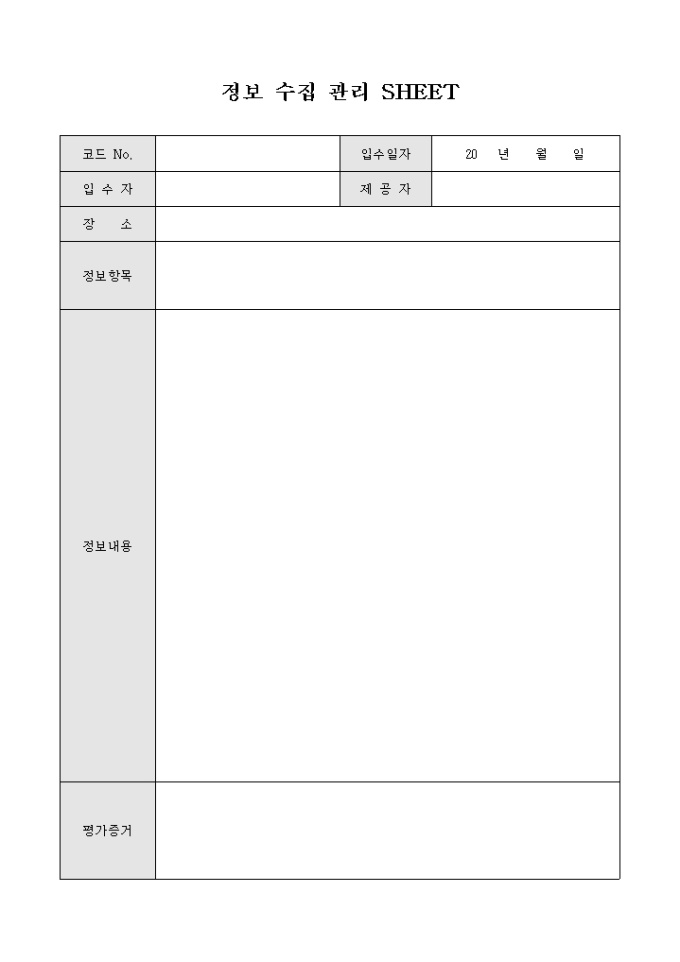 정보를 수집하고 관리하기 위하여 작성하는 정보 수집 관리 SHEET 양식으로 정보항목과 정보내용, 평가 증거 등의 사항을 기재할 수 있습니다.