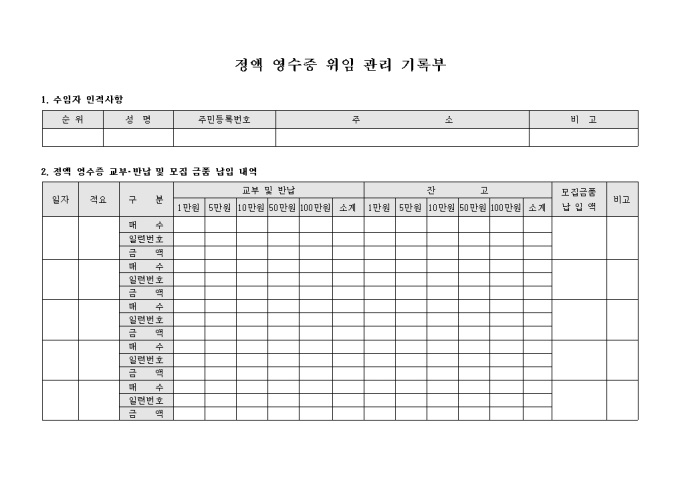 9,000원/월정액 영수증의 교부와 반납 및 모집 금품 납입 내역 등을 기록할 수 있는 정액영수증 위임 관리 기록부입니다.