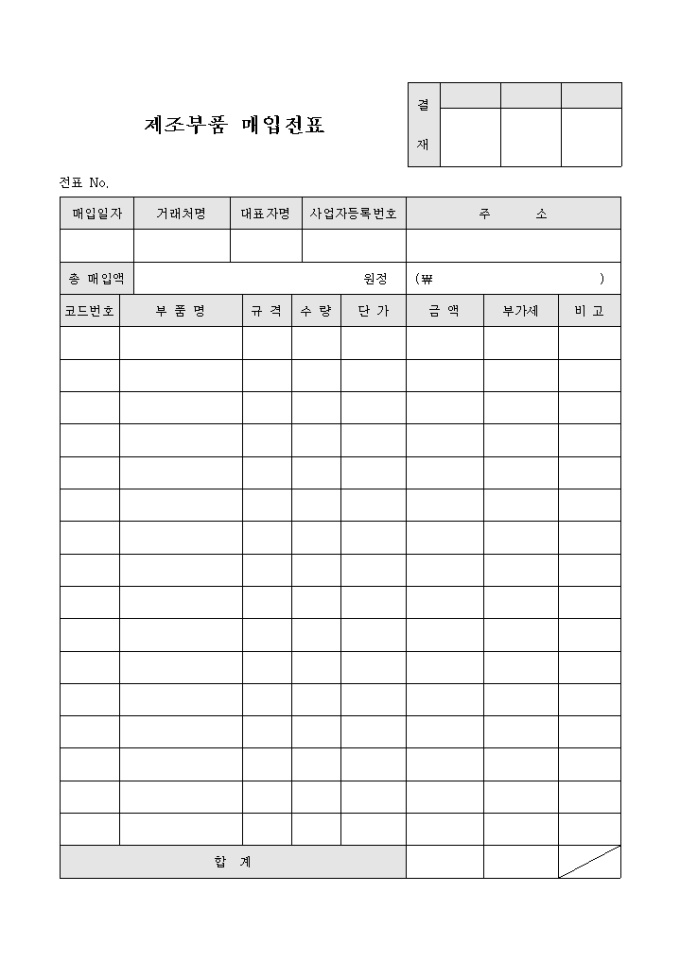 제조부품 매입 전표입니다. 제조부품의 매입 수량과 규격, 단가를 기록 할 수 있도록 구성되어 있습니다.