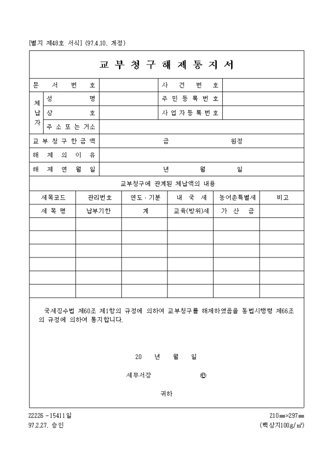 국세징수법 제60조 제1항의 규정에 의하여 교부청구를 해제하였음을 동법시행령 제66조의 규정에 의하여 통지하실때 사용하는 양식입니다.