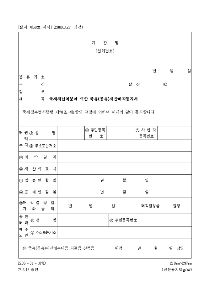 9,000원/월[별지 제60호 서식] 국세체납처분에의한국유.공유재산매각통지서 양식입니다. 국세징수법시행령 제78조 제1항의 규정에 의하여 아래와 같이 통지하실때 사용하는 양식입니다.