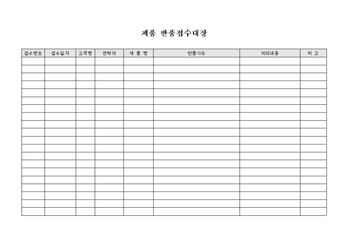 9,000원/월제품 반품접수 대장입니다. 제품명과 반품사유, 처리내용을 기록 할 수 있도록 구성되어 있습니다.