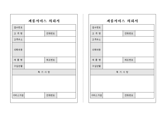 9,000원/월2부로 나누어 사용이 가능한 제품서비스 의뢰서입니다. 접수번호와 고객명, 의뢰내용을 기록 할 수 있도록 구성되어 있습니다.
