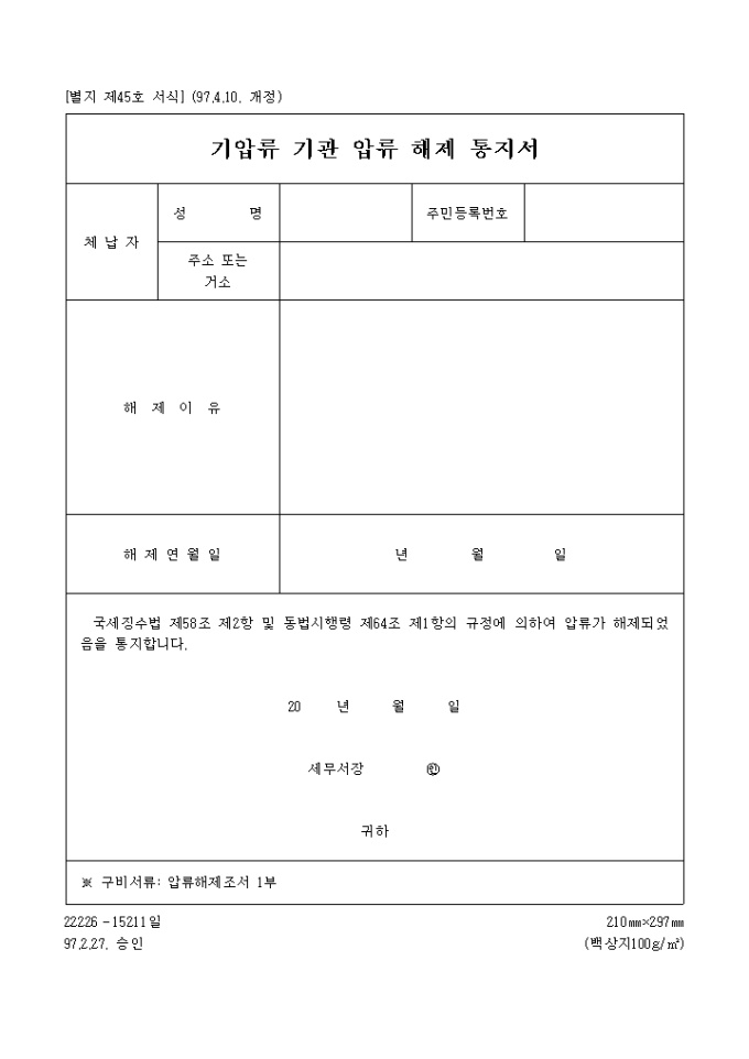 국세징수법 제58조 제2항 및 동법시행령 제64조 제1항의 규정에 의하여 압류가 해제되었음을 통지하실때 사용하는 양식입니다.