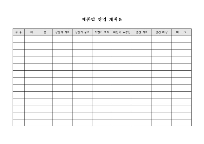 9,000원/월제품별 영업과 관련된 상반기와 하반기의 판매계획을 세울 수 있도록 구성된 영업 계획표입니다.