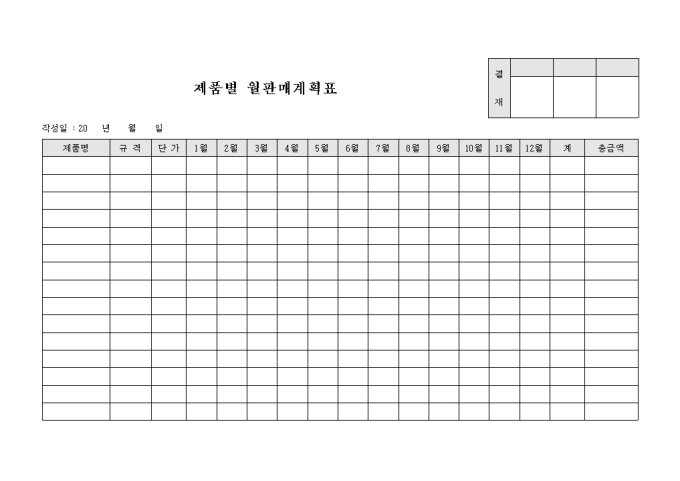 월별 제품판매 계획표입니다. 제품에 따른 월별 판매량을 집계 할 수 있습니다.
