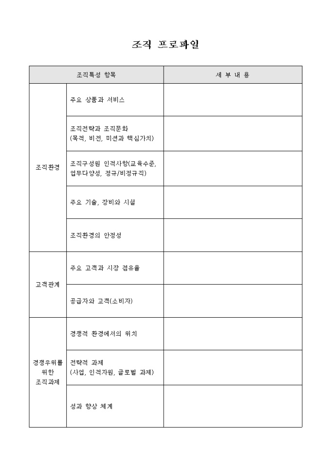 9,000원/월조직환경, 고객관계, 경쟁우위를 위한 기본과제로 구성된 조직 프로파일 입니다.