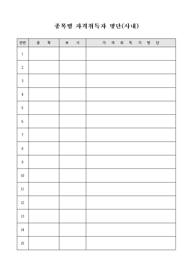 사내에서 종목별로 자격증을 취득한 인원 현황을 관리할 수 있도록 만들어졌으며 종목, 부서, 취득자 명단 등을 기입하여 사용할 수 있게끔 제작된 서식입니다.