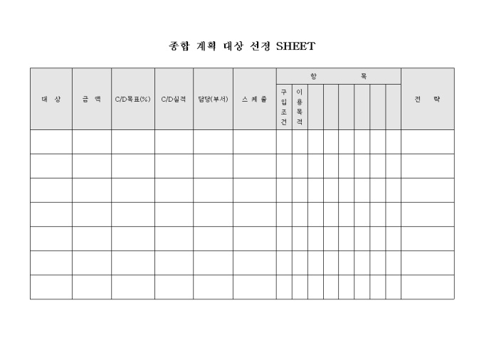 9,000원/월여러 대상의 금액, 목표, 실적, 담당부서, 스케줄 및 대상의 항목과 전략을 기재하여 종합적인 계획의 대상으로 선정하기 위한 종합 계획 대상 선정 SHEET 양식입니다.
