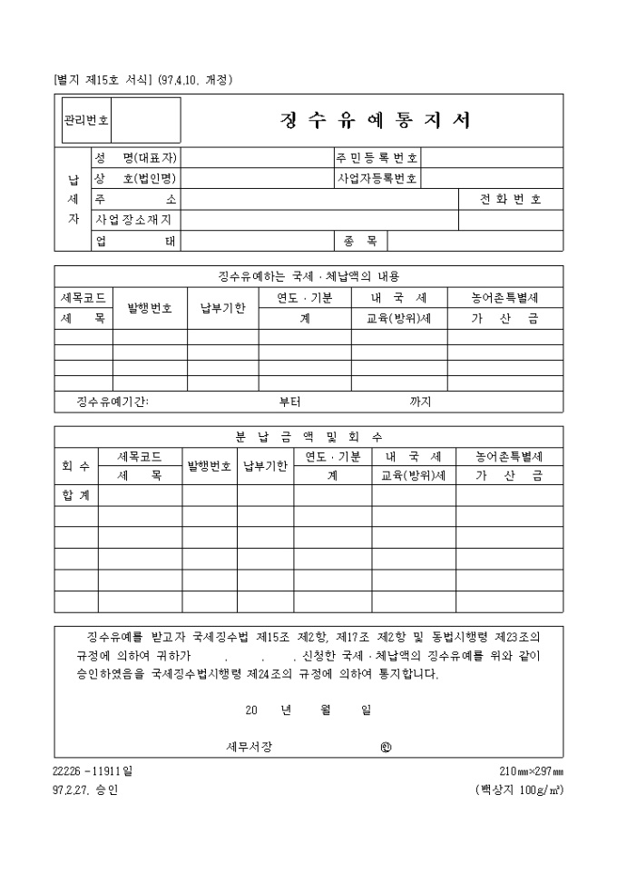 9,000원/월[별지 제15호 서식] 징수유예통지서 양식입니다. 징수유예를 받고자 국세징수법 제15조 제2항, 제17조 제2항 및 동법시행령 제23조의 규정에 의하여 귀하가 . . . 신청한 국세 체납액의 징수유예를 위와 같이 승인하였음을 국세징수법시행령 제24조의 규정에 의하여 통지하실때 사용하는 양식입니다.