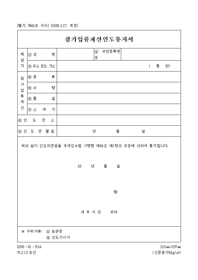 위와 같이 인도하겠음을 국세징수법 시행령 제64조 제2항의 규정에 의하여 통지하실때 사용하는 양식입니다.