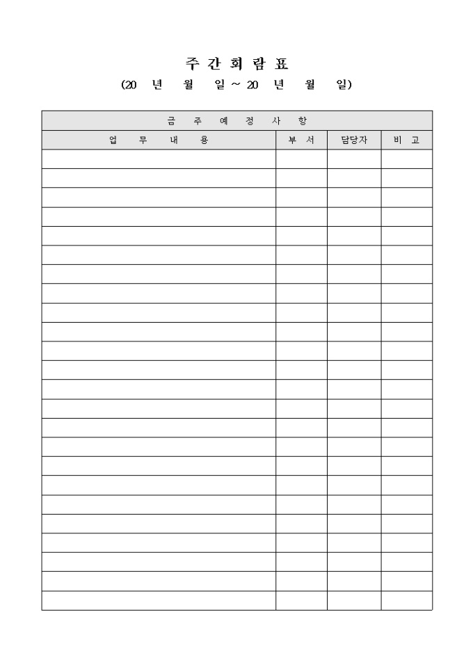 금주의 예정사항과 업무내용 및 부서별 담당자를 기록할 수 있는 주간 회람표 입니다.