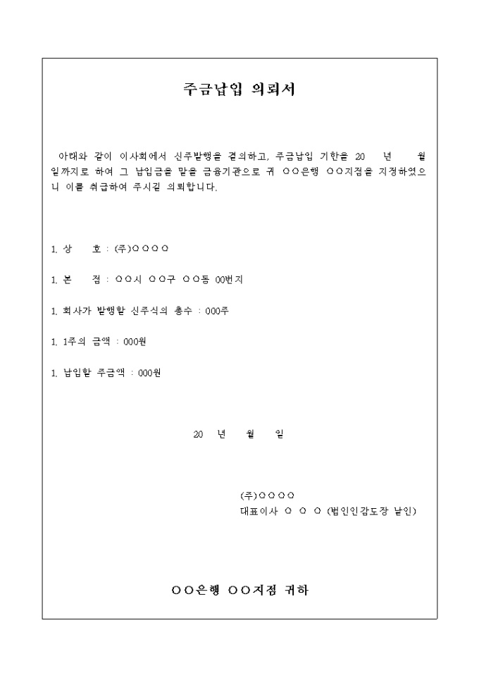 신주 발행을 통한 주식 금액을 납입하기 위하여 은행을 지정하고 은행에 대하여 납입금을 취급해주길 의뢰하는 주금납입 의뢰서 양식입니다.