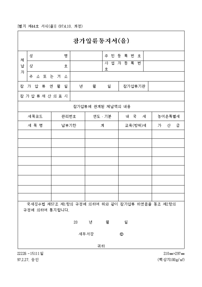 [별지 제44호 서식(을)] 참가압류통지서(을) 양식입니다. 국세징수법 제57조 제1항의 규정에 의하여 위와 같이 참가압류 하였음을 동조 제2항의 규정에 의하여 통지하실때 사용하는 양식입니다.