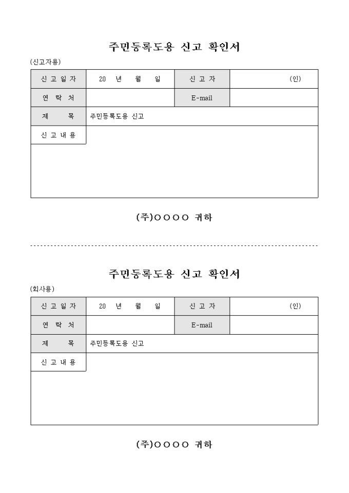 주민등록 도용 신고에 대한 내용을 확인시 사용하는 신고 확인서 입니다. 신고자용과 회사용으로 구분되어 있습니다.