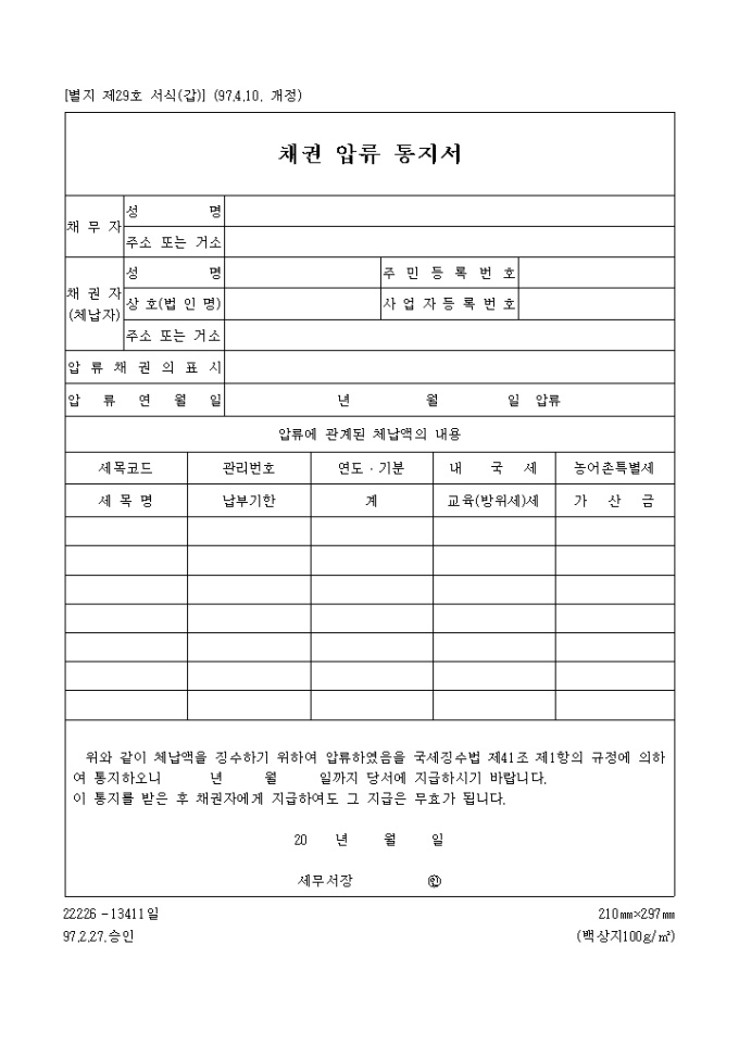9,000원/월[별지 제29호 서식(갑)] 채권압류통지서 양식입니다. 위와 같이 체납액을 징수하기 위하여 압류하였음을 국세징수법 제41조 제1항의 규정에 의하여 통지하오니 년 월 일까지 당서에 지급하시기 바랍니다. 이 통지를 받은 후 채권자에게 지급하여 도 그 지급은 무효가 됩니다. ...
