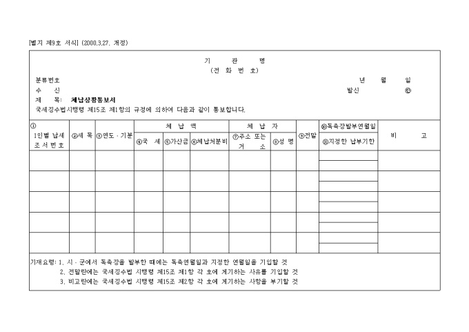국세징수법시행령 제15조 제1항의 규정에 의하여 다음과 같이 통보하실때 사용하는 양식입니다.