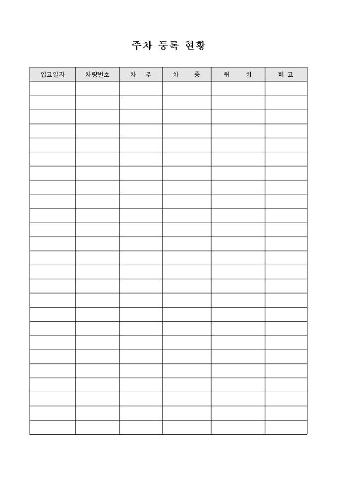 주차장에서 사용하는 주차 등록 현황입니다. 차량번호와 차종, 위치 등을 기록하여 주차 관리시 사용합니다.