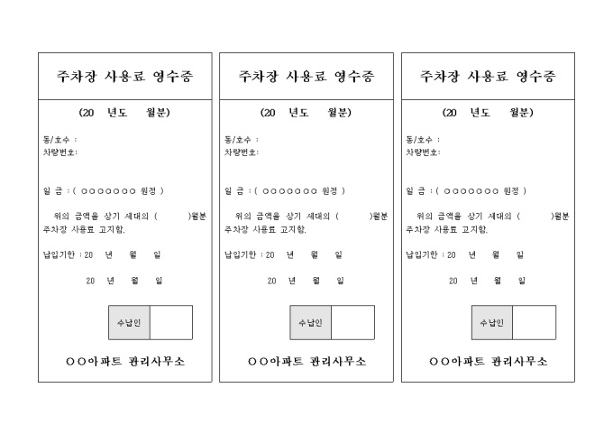 아파트 관리소 등에서 사용할 수 있는 주차장 사용료 영수증 양식입니다.