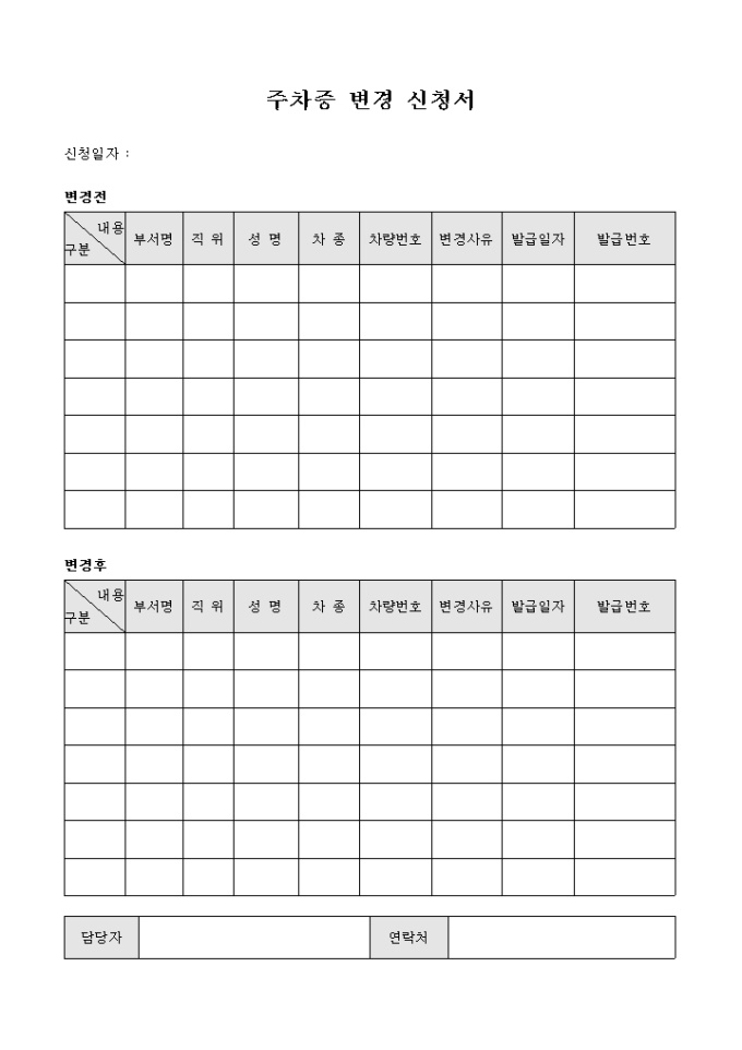 9,000원/월주차증 변경을 신청할 때 사용합니다. 변경전과 변경후의 주차증 내용을 기록할 수 있습니다.
