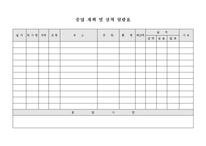 증답 계획과 실적일람을 기록할 때 사용하는 증답 계획 및 실적 일람표입니다.