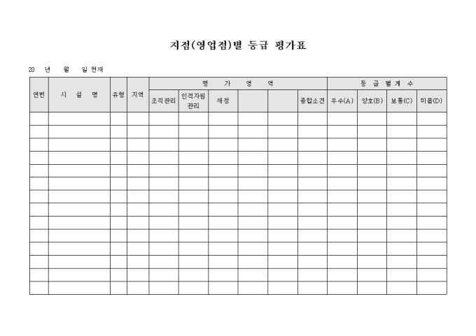 9,000원/월지점별 등급 평가표 입니다. 지점의 평가영역에 따른 등급을 기록 할 수 있도록 구성되어 있습니다.