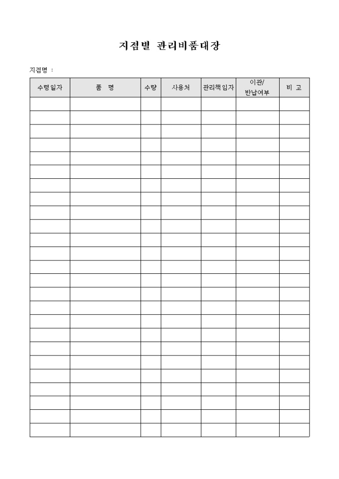 9,000원/월지점별 관리비품 대장입니다. 비품의 수령일자와 품명, 반납 여부를 포함 다수 항목으로 구성되어 있습니다.